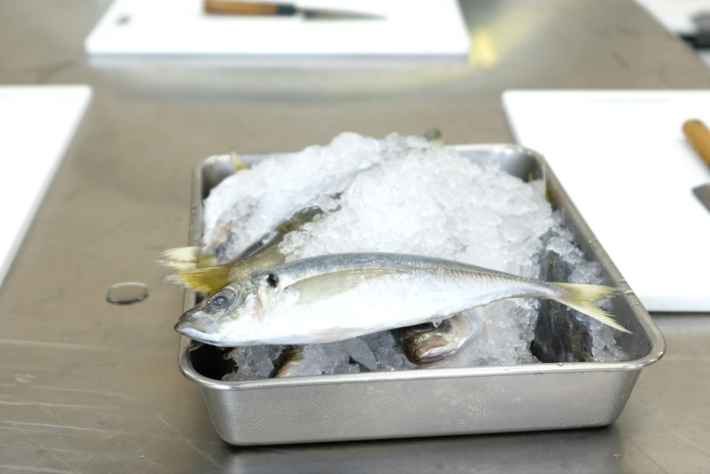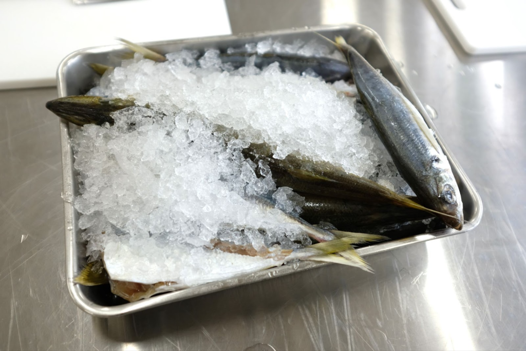 横浜市場で仕入れた、カマス、アジをさばいていきます。