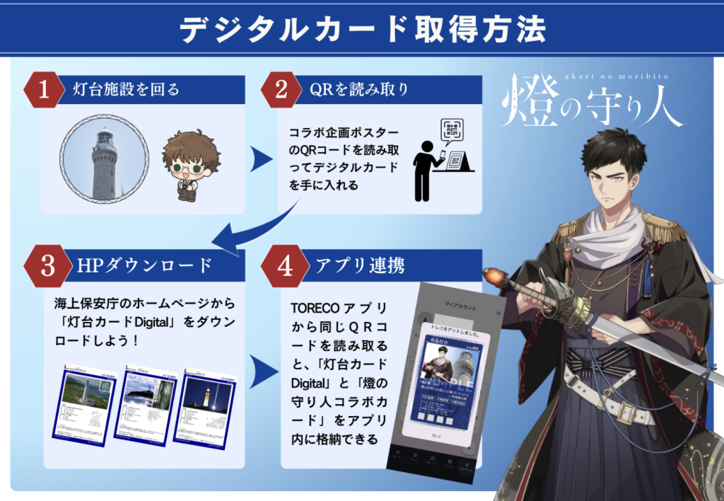 本コラボでは、TORECO上にて1基の灯台につき2種類のデジタルカードを入手することができます。ひとつは、海上保安庁がこれまで配布してきた「灯台カードDigital」。もうひとつは、『燈の守り人』オリジナルの灯台コラボカードです。これら2種類のカードが、同一のプラットフォーム上でダウンロードできるようになります。