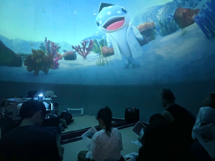 「海の大冒険!ブッチくんと学ぶ探検ツアー!」は、巨大なエアドーム内に投影される360度の海中映像を通して、まるで海に潜っているかのような没入体験ができるプログラム。おしゃべりなジンベイザメ「ブッチくん」がナビゲーターを務め、参加者とリアルタイムに対話をしながら、海の魅力や生き物の生態、海洋問題などについて分かりやすく解説してくれます。