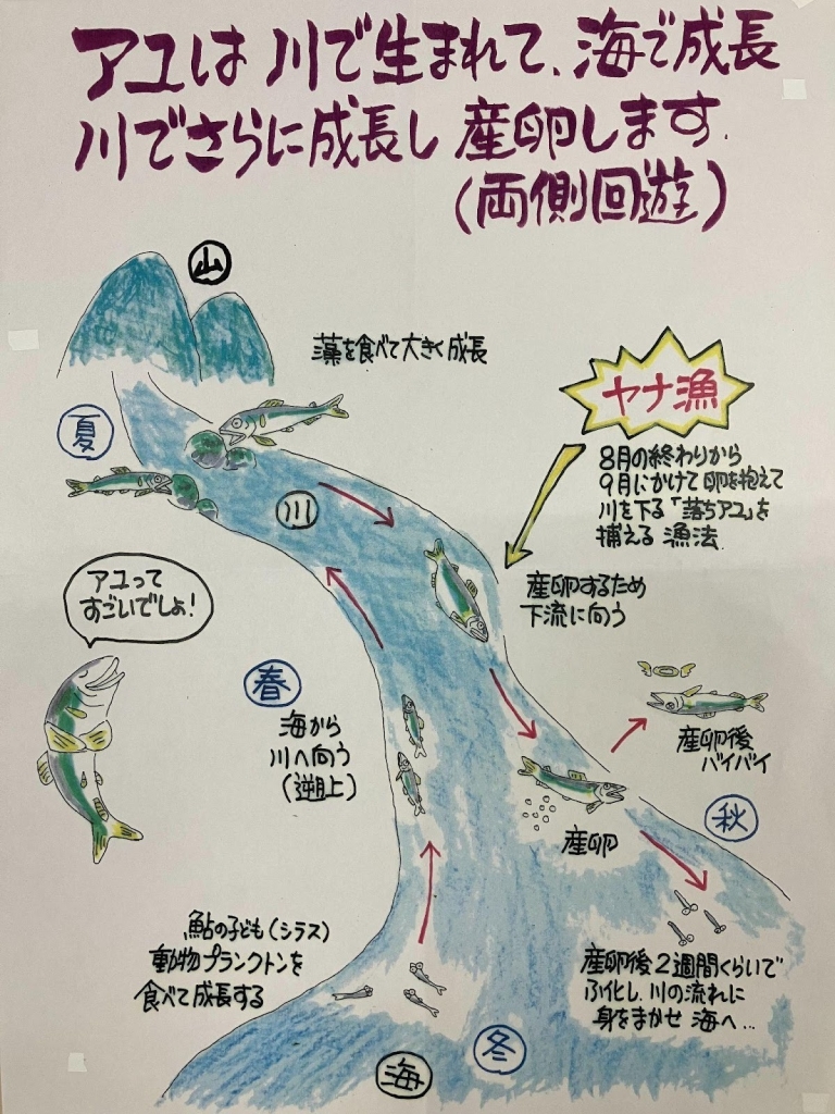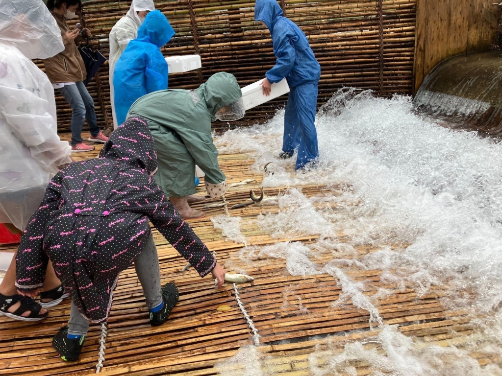 「ヤナ漁」とは、川の中に木や竹で作ったすのこ状の梁(やな)を設け、上流から泳いできた魚を捕まえる伝統的な漁法。この日は、あいにくの雨でしたが、子どもたちははねる鮎を手で捕まえ、山・川・海の恵みと命の尊さを実感していました。