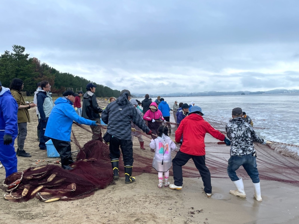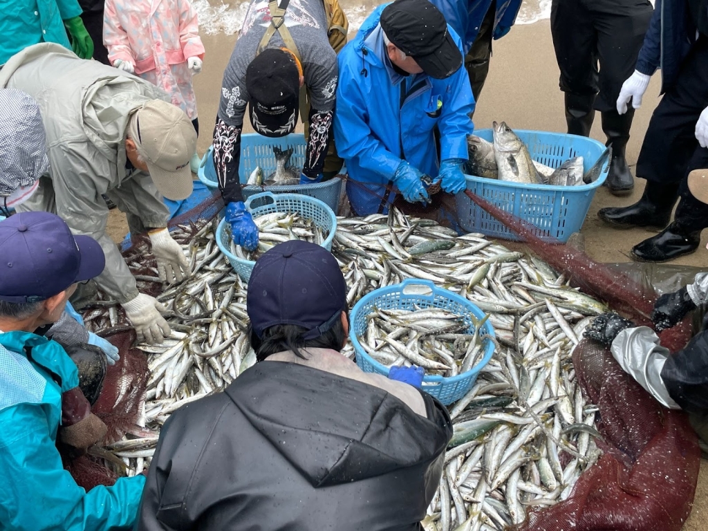 参加者はまず、島尾海水浴場で地元漁師の指導のもと伝統的な地引網漁を体験。その後、余川谷営農研修会館に移動し、氷見市で80年続く鮮魚店「弥助」の3代目・二塚勉さんによるフクラギのさばき方教室が開催。さらに、”富山のさかなクン”と親しまれる東京海洋大学博士課程の大屋進之介さんが、獲れたての魚やフクラギの生態をわかりやすく解説しました。