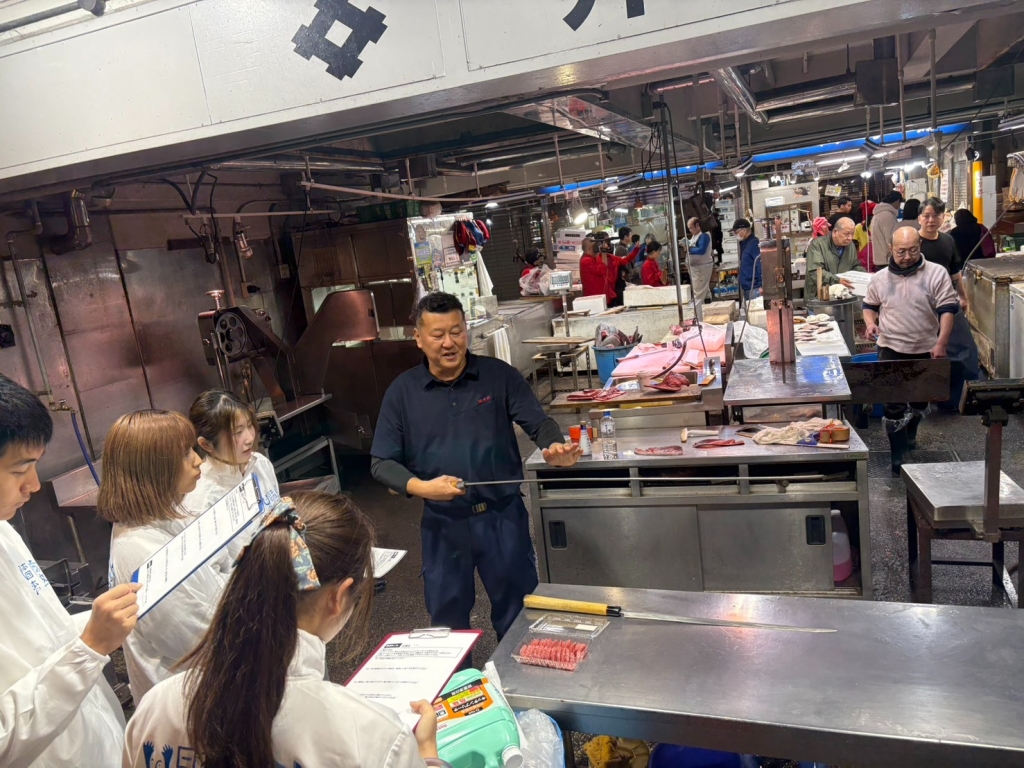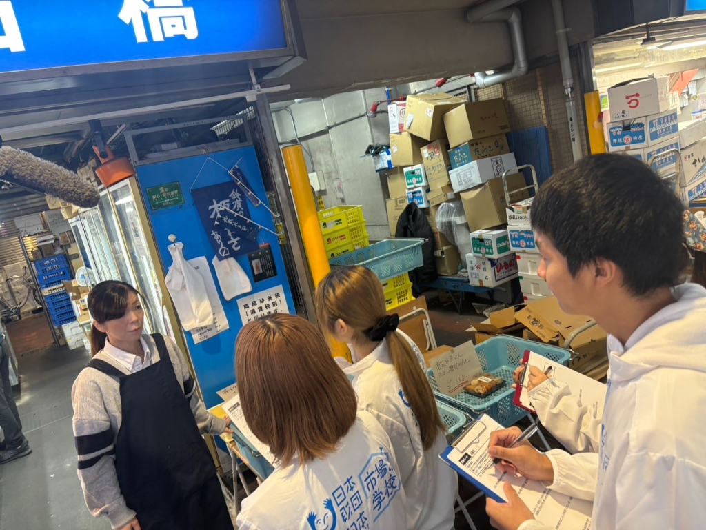 今回の取材では、まぐろの名店「井桁」、練り物の「石橋」、高級魚を扱う「坪倉水産」、鮮度抜群の「大髙」、そして“おさかなマイスター”の「ムラマツ」という5店舗を訪問しました。各店で働く方々から、水産物の取り扱いに込められた工夫や仕入れのこだわり、日々の仕事に対する熱い思いを伺い、現場ならではのリアルな声を聞くことができました。今回はテレビカメラも同行しているので、私たちもお店の方々も自然と熱が入り、普段以上に活気ある取材となったのが印象的です。市場全体に漂うエネルギッシュな雰囲気の中で、食の流通を支える人々の姿を間近に見られたことは、単なる取材を超えた学びの機会でした。魚を扱うプロの技術や誇り、そして「美味しいものを届けたい」という真っ直ぐな想いが交差する現場は、まさに市場の鼓動そのもの。食の豊かさを支える人々の存在を改めて実感し、大きな刺激を受けました。