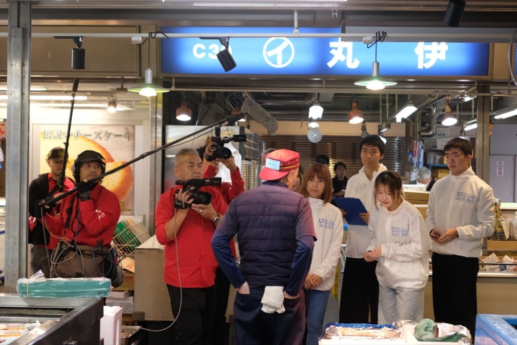 仲卸店舗を「取材」する私たちを、テレビカメラが「取材」のW取材