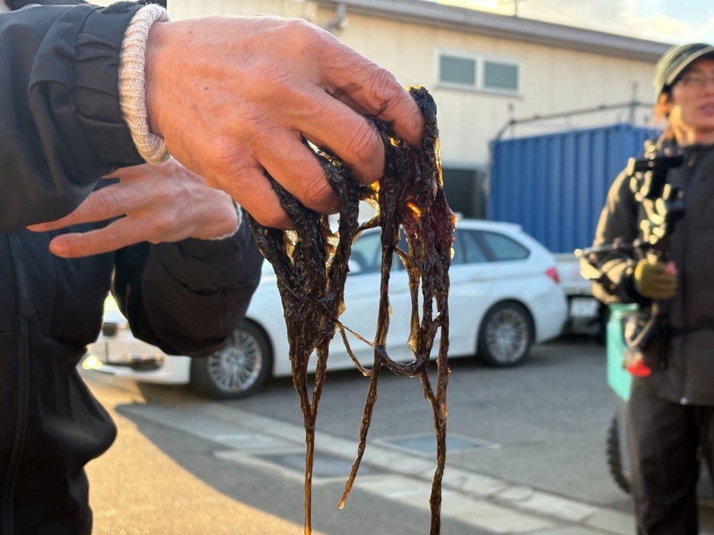 翌日は早朝の海へ繰り出し、朝日の中で「潜り船」による海苔摘みを間近で見学。獲れたての生海苔を試食し、その鮮烈な味に参加者からは興奮の声が上がりました。続いて海苔の加工場を見学した後、生産者と共に海苔の朝食づくりを体験。さらに色落ち海苔を活用したスピリッツ製造など、地域資源を活かす最新の取り組みについても理解を深めました。